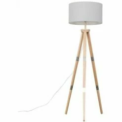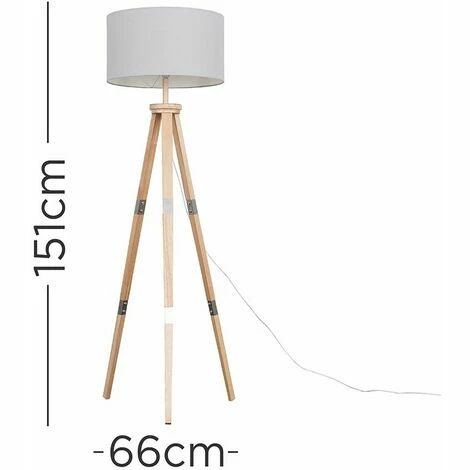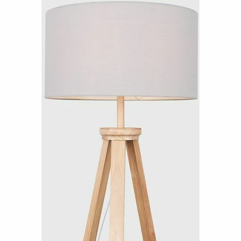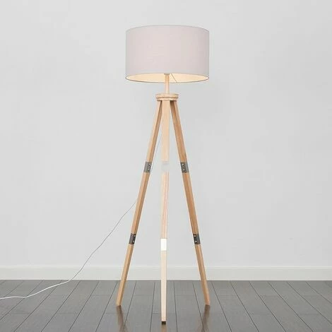 This MiniSun floor lamp features a wooden tripod design base and comes in a light wood finish. Complete with a large fabric drum shade in a range of colour options to suit all decors.