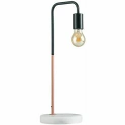 Pair of retro style metal rod frame table lamps in a matt black and copper finish with a white solid marble base. These lamps are constructed from high quality materials and the marble base makes these lamps extremely sturdy. This contemporary table lamp is guaranteed to make a statement in any home.
