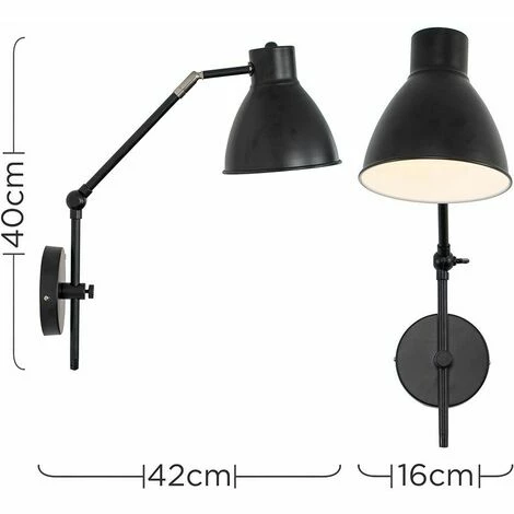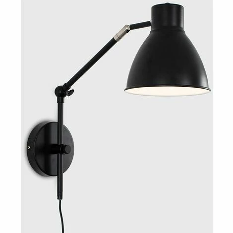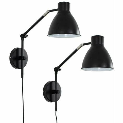 Pair of retro style wall light fittings in a black metal finish with a wide tapered shaped light shade. These wall lights are equipped with a cable plug and on/off switch meaning that there is no need for wiring hiring an electrician or fiddly DIY. Simply plug into the mains once fixed to the wall and enjoy!