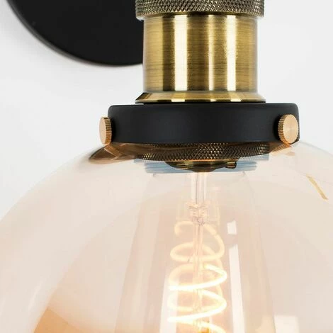 Pair of retro style wall light fittings in an antique brass and black metal finish complete with an amber tinted glass shade. These wall lights feature a knuckle joint that allows you to adjustable the angle of the lamp into your desired position. Wall lights are a great way to bring additional lighting to a room and are particularly useful to illuminate a dull alcove.