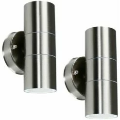 A pair of wall mounted up / down outdoor lights in a brushed chrome metal finish has a modern flush cylinder design and is ideal for lighting gardens paths garages patios courtyards decorative porches and driveways. IP44 outdoor weatherproof rated security light – providing extra safety for the home and giving peace of mind. These wall-mounted outdoor flush lights come in a sturdy and weatherproof durable design and emits bright light from both the top and bottom. These robust illuminating external lights are IP44 Rated and is fully certified for outdoor installation.