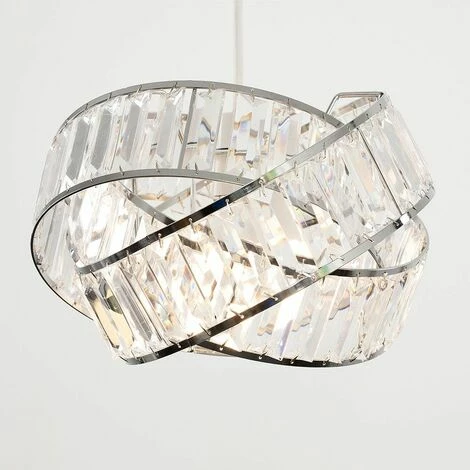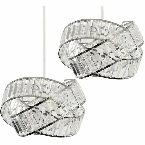 Pair of modern intertwined rings design ceiling pendant light shades in a polished chrome finish clear crystal effect acrylic beads. These contemporary ceiling lights are a great main source of light to lounges dining rooms and other living areas. This light is a great focal point-