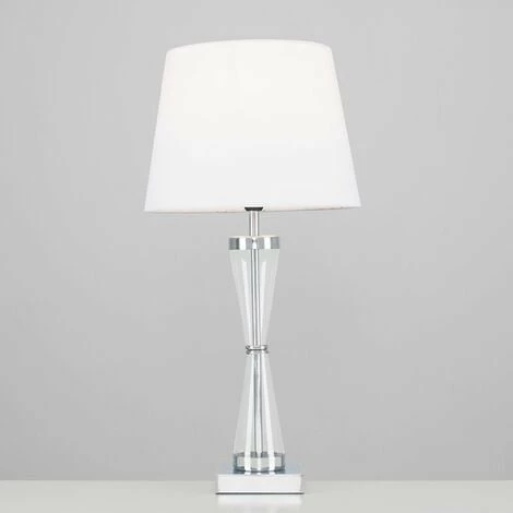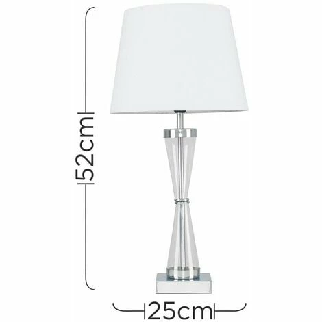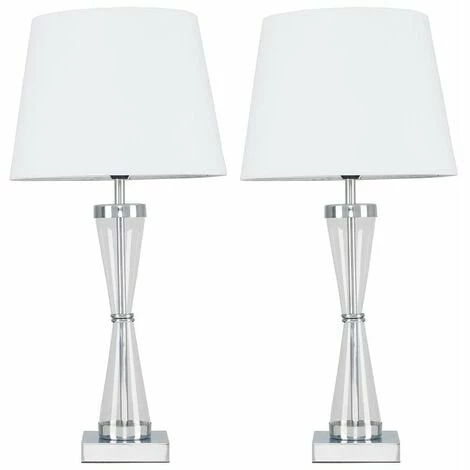 Give any living area a touch of character with this pair of hourglass design table lamps in a silver polished chrome metal finish. Each lamp white fabric tapered light shade. Features an in-line on/off switch for easy use.