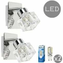 A modern pair of ice cube wall lights in a polished silver chrome finish. Featuring glass ice cube effect shades which diffuse the light evenly throughout the room. These contemporary wall lights come complete with full fitting instructions. Ideal for living & dining rooms kitchens bedrooms and hallways. Wall lights are a great way to bring additional lighting to a room and are particularly useful to illuminate a dull alcove. 2 x 3w Energy Saving Long Life G9 LED Light Bulbs Included