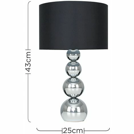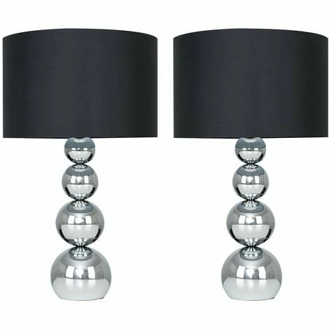 Pair of chrome stacked balls touch table lamps with a black faux silk shade. Simply touch the metal base to turn the lamp on. Features a 4 stage touch dimmer low medium bright and off. Please Note This lamp requires dimmable bulbs. Not suitable for standard LED or energy saving bulbs.