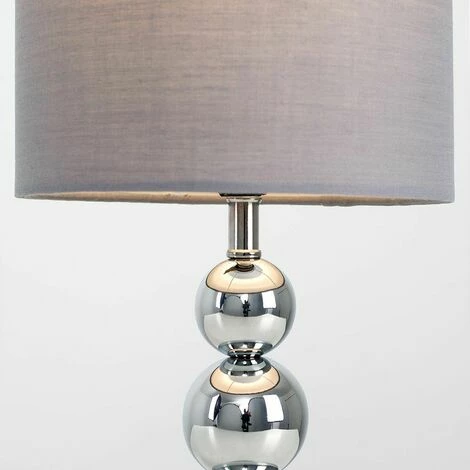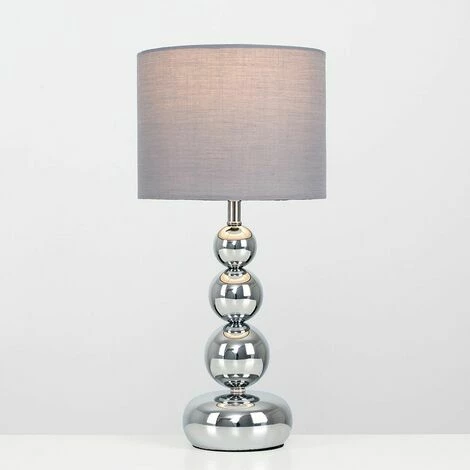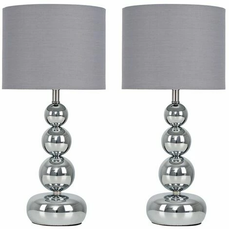 Pair of modern stacked balls design touch table lamps in a silver polished chrome metal finish with a grey fabric cylinder lamp shade. Touch the base to turn on and get three intensities of light.