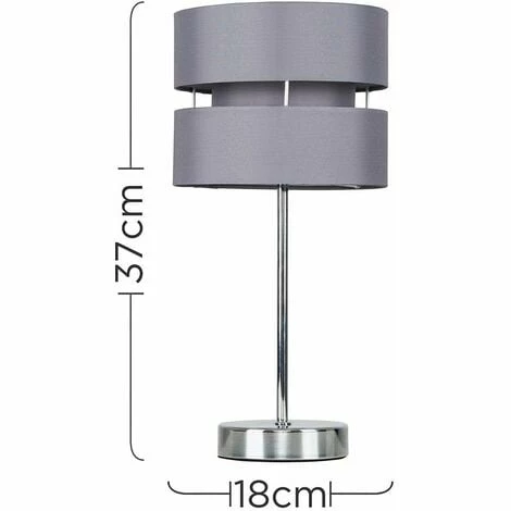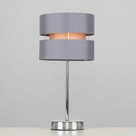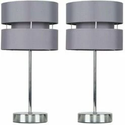 Pair of modern single stem table lamps in a silver chrome metal finish grey double layered fabric lamp shades.