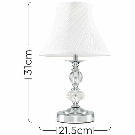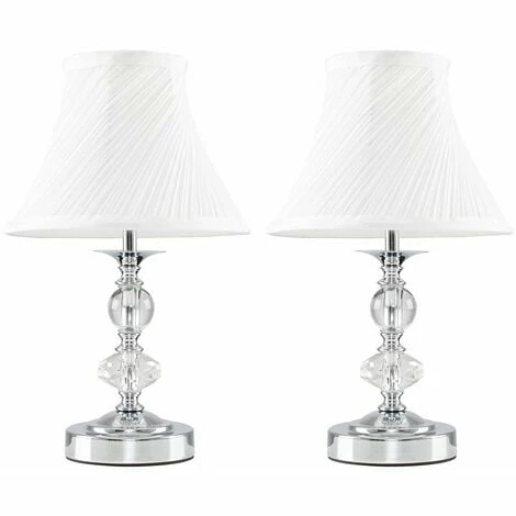 Pair of modern polished chrome touch table lamps with pleated white shade and stunning glass features on the stem. Simply touch the base to cycle through the 4 stages of the dimmer low medium high and off. This lamp is a great way to add style and some extra light to a room. Its style matches perfectly with both modern and traditional decor. Ideal for lounges hallways bedrooms and other living areas.