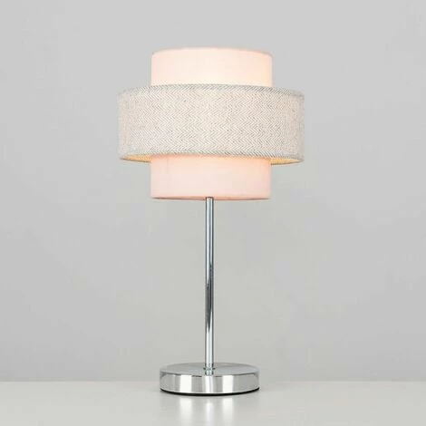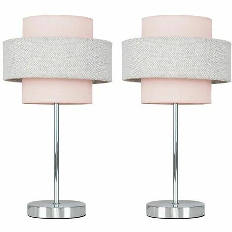 Pair of modern touch table lamps in a silver polished chrome metal finish. Complete with a cylinder lamp shade in a pink and grey herringbone faux linen finish. Table lamps are a great way to bring additional lighting to a room or you can use them to reduce your main light output and create a more relaxing mood/atmosphere. Touch the base to turn on and get three intensities of light. Please Note These lamps require dimmable bulbs. Not suitable for standard LED or energy saving bulbs.