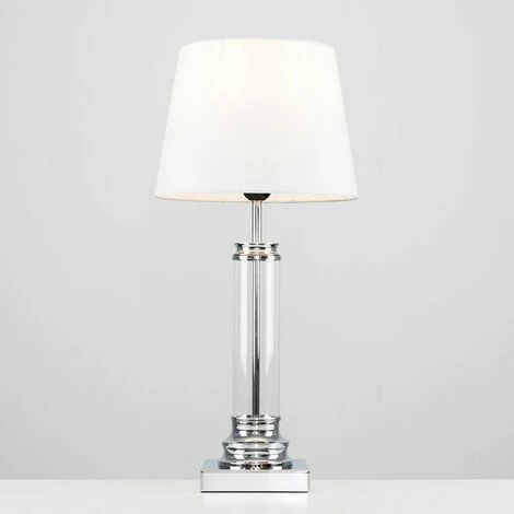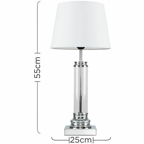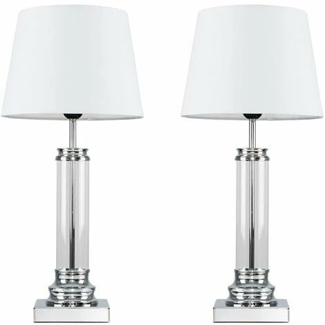 Pair of modern column stem touch table lamps in a clear glass finish white cotton tapered light shades. Features a 4 stage touch dimmer low medium bright and off. These contemporary lights are a great way to update any living area to create a relaxing ambient atmosphere. Please Note This lamp requires dimmable bulbs. Not suitable for standard LED or energy saving bulbs.