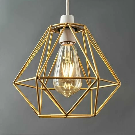 Pair of retro style metal ceiling pendant light shades in a gold effect finish. Features an open design which shades the bulb whilst allowing light to disperse effectively and evenly throughout the room.