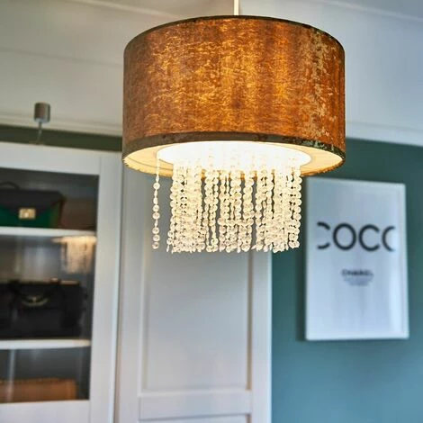 Pair of modern cylinder ceiling pendant light shades in a gold velvet finish which features clear acrylic jewel droplets which cast subtle patterns around the room when lit. Ideal for lounges dining rooms bedrooms hallways and other areas around the home. Easily fits to your existing ceiling lampholder – no electrician required. Ceiling lights are usually the main light source in a room. The right fitting can create a statement and complete your living space look.