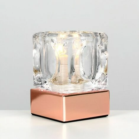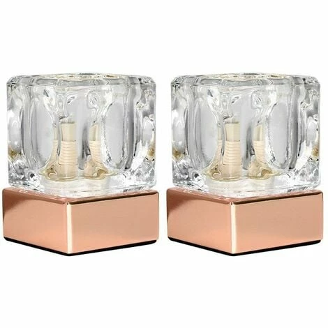 Pair of modern bedside touch table lamps in a copper effect metal finish complete with a clear glass ice cube design shade. Simply touch the metal base to turn the lamp on – no more trying to find the switch at night. The light can be set to 4 stages off a low level light for mood lighting a medium level light for general lighting and a high level light which is the brightest setting to create an intense pool of light.