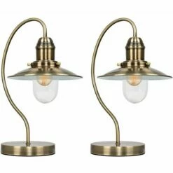 Pair of modern curved neck fisherman style touch table lamps in an antique brass finish with a clear glass shade. Simply touch the metal base to turn the lamp on. Features a 4 stage touch dimmer low medium bright and off. Please Note This lamp requires dimmable bulbs. Not suitable for standard LED or energy saving bulbs.