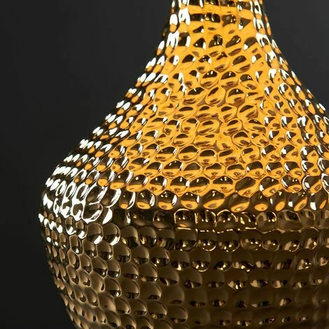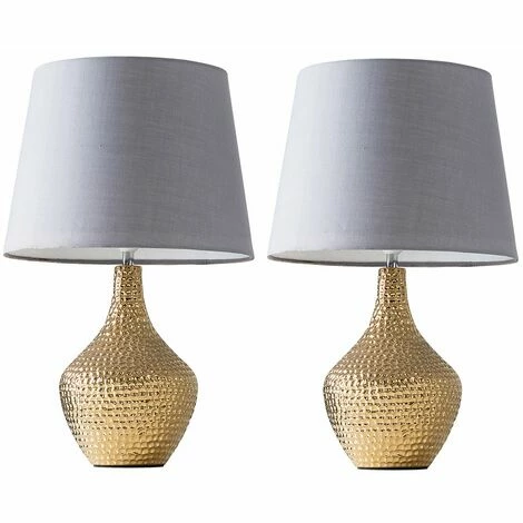 This pair of MiniSun indent textured design table lamps come in a gold ceramic finish. Complete with a fabric lampshade in a range of colours. Ideal for living rooms dining rooms bedrooms and more.