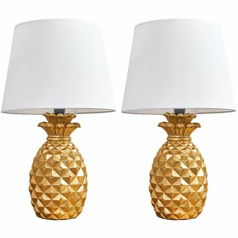 Pair of contemporary pineapple design table lamps in a gold effect finish white tapered light shades.