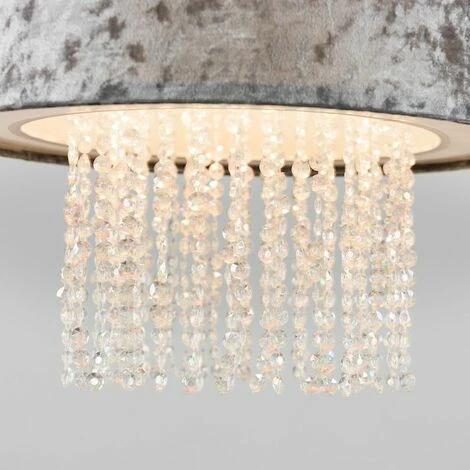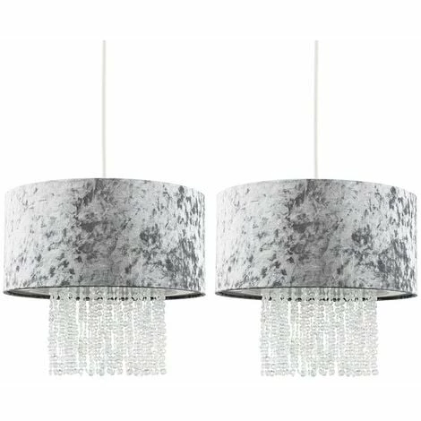 Pair of modern cylinder ceiling pendant light shades in a silver grey velvet finish which features clear acrylic jewel droplets which cast subtle patterns around the room when lit. Ideal for lounges dining rooms bedrooms hallways and other areas around the home. Easily fits to your existing ceiling lampholder – no electrician required. Ceiling lights are usually the main light source in a room. The right fitting can create a statement and complete your living space look.