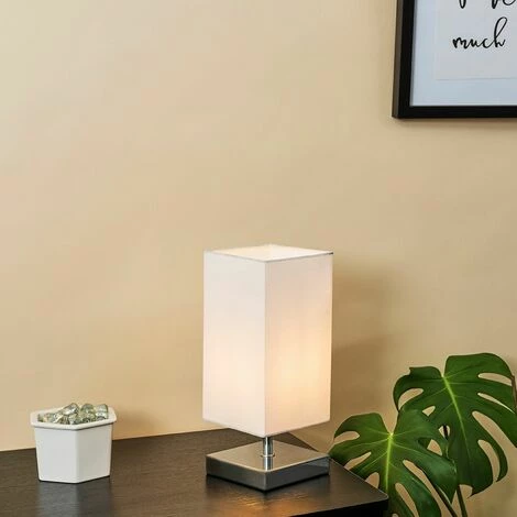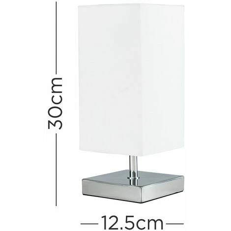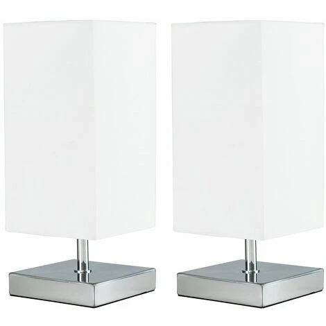 Pair of modern square shaped base touch table lamps in a polished chrome metal finish with a white fabric rectangular lamp shade. Simply touch the metal base to turn it on. The light can be set to 4 stages off a low level light for mood lighting a medium level light for general lighting and a high level light which is the brightest setting to create an intense pool of light. Please Note These lamps require dimmable bulbs. Not suitable for standard LED or energy saving bulbs.