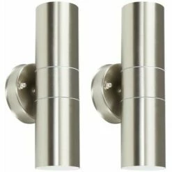 A pair of these modern stainless steel outdoor wall lanterns are an ideal product to help create a warm and inviting glow to doorways porches and external walls. A stylish way to add security to your home it is perfect for gardens driveways patios and garages. Light emits from the top and bottom of the IP44 rated weatherproof lamps – fully certified for outdoor installation. The ideal bulbs to use with this product are 4 x 3GU10 bulbs – NOT supplied.