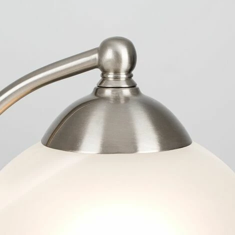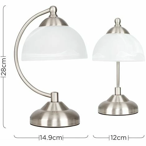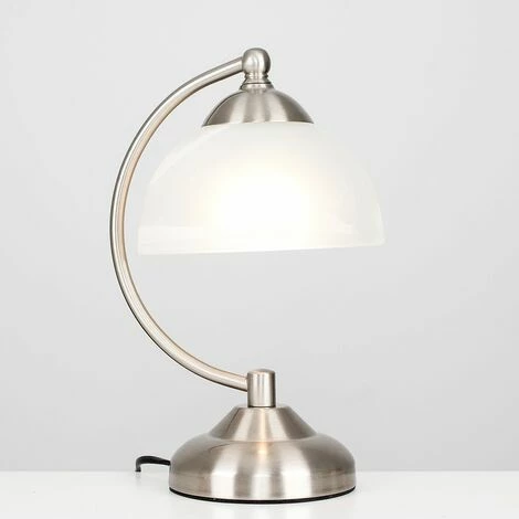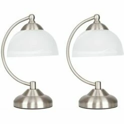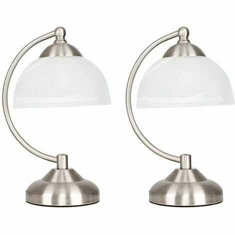 Pair of Contemporary style crescent shaped table lamp in a brushed chrome finish. Featuring a frosted glass domed shade. Ideal in the lounge bedroom or dining room.