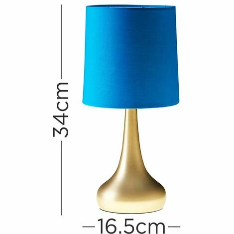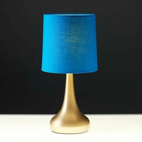 These fantastic touch table lamps with a curved polished gold effect metal bases are a wonderful addition to any contemporary home. The French blue fabric shades allow the light to be dispersed evenly throughout the room. Simply touch the metal base to turn it on. The light can be set to 4 stages off a low level light for mood lighting a medium level light for general lighting and a high level light which is the brightest setting to create an intense pool of light. Please Note This lamp requires dimmable bulbs. Not suitable for standard LED or energy saving bulbs.