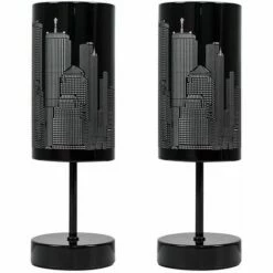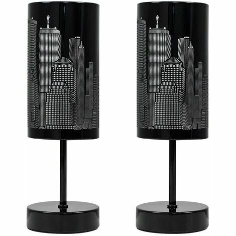 Pair of modern touch table lamps in gloss black finish. Simply touch the lamp to turn it on. Fantastic New York Skyline cut-out design shade which lights up beautifully when the lamp is on. The light can be set to 4 stages off a low level light for mood lighting a medium level light for general lighting and a high level light which is the brightest setting to create an intense pool of light.