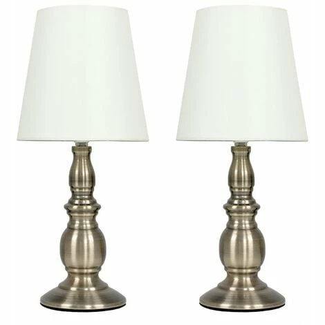 Pair of Traditional style touch table lamps in an antique brass effect finish with a cream shade. Simply touch the metal base to turn it on. The light can be set to 4 stages off a low level light for mood lighting a medium level light for general lighting and a high level light which is the brightest setting to create an intense pool of light. Please Note This lamp requires dimmable bulbs. Not suitable for standard LED or energy saving bulbs.