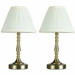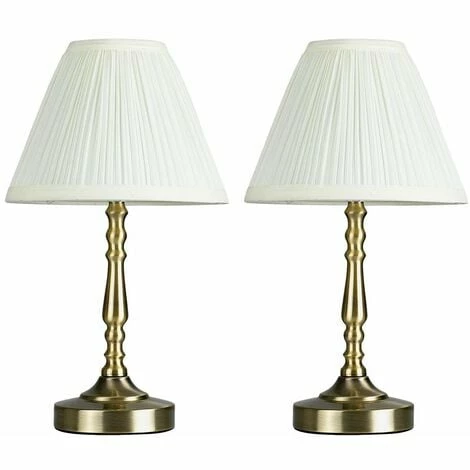 Pair of vintage style antique brass touch table lamps with a pleated cream shade. Simply touch the base to cycle through the 4 stages of the dimmer low medium high and off. Its style matches perfectly with both modern and traditional decor. Please Note These lamps require dimmable bulbs. Not suitable for standard LED or energy saving bulbs.