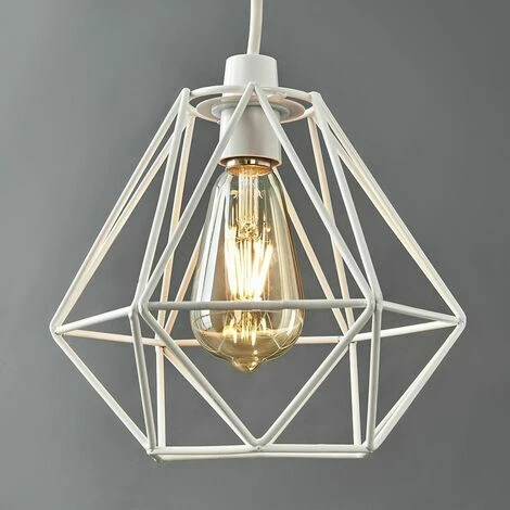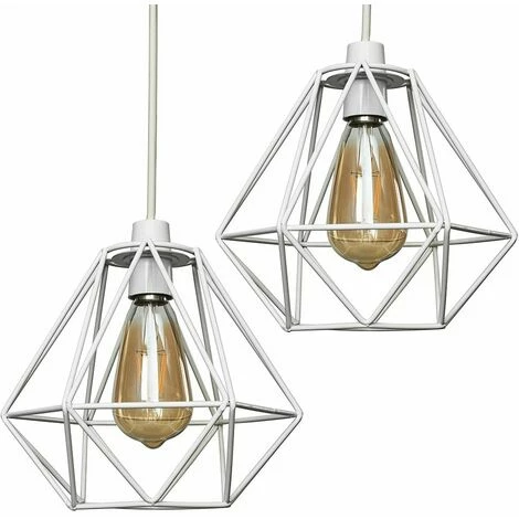 Pair of retro style metal ceiling pendant light shades in a white finish. Features an open design which shades the bulb whilst allowing light to disperse effectively and evenly throughout the room.