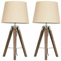 Pair of modern tripod style table lamps in a distressed wood effect and silver chrome finish which features an in-line on/off switch for easy use+ beige cotton tapered light shades.