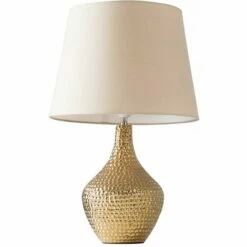 This MiniSun indent textured design table lamp comes in a gold ceramic finish. Complete with a tapered light shade in a range of colour options. Ideal for living rooms dining rooms bedrooms and more.