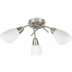 Modern 3 way curved arm cross over design ceiling light in a brushed chrome metal finish with frosted glass shades. Ideal for bedrooms hallways lounges and other living areas.
