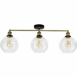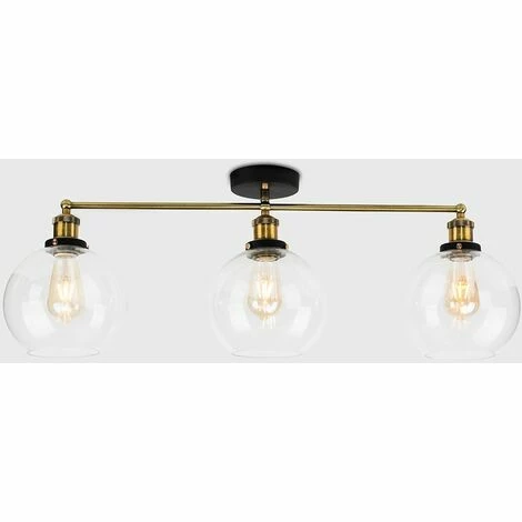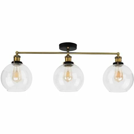 Retro steampunk style 3 way ceiling light fitting in a black and gold effect metal finish. Complete with clear glass globe shades. Ideal for living rooms bedrooms dining rooms and hallways.