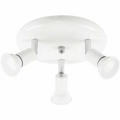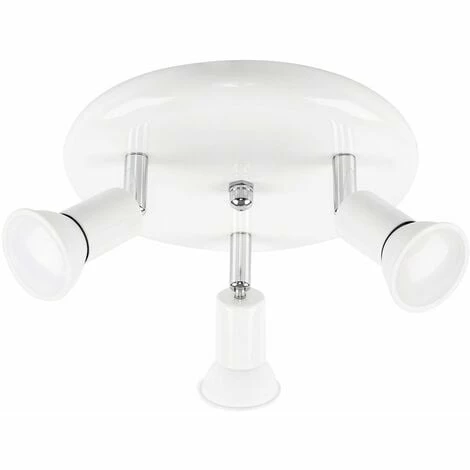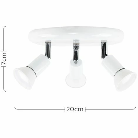 Modern adjustable 3 way spotlight in a beautiful gloss white and polished chrome finish. This spotlight is suitable for ceiling mounting and is ideal for lounges dining rooms kitchens bedrooms and other living areas. Spotlights are a great way to bring additional illumination into a room. The adjustable heads enable you to direct the light source to exactly where you want it. 3 x 50w GU10 Halogen Bulbs Required.