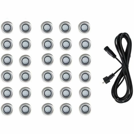 Complete Stainless Steel Decking / Plinth Lights Kit. Includes all bulbs cables and connections. Update your garden with these fantastic lights. These White LED’s light up your decking beautifully. IP67 outdoor rating. Supplied with a 3M extension cable. A maximum of 3 x 3M extension cables can be used per decking light kit.