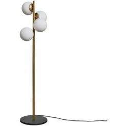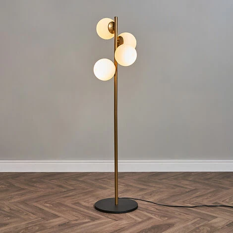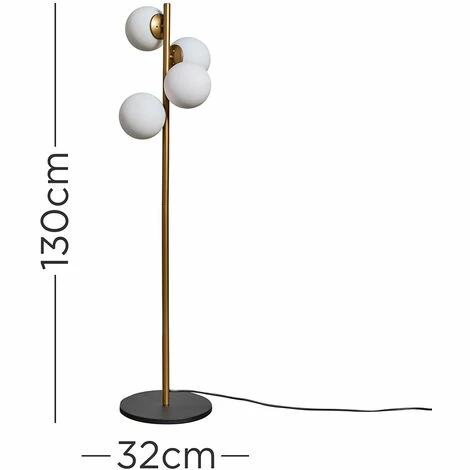 This MiniSun floor lamp comes in a gold metal finish and features a 4 way design woith white glass globe shades. Complete with an in-line on/off foot switch for easy use. Perfect for adding a modern style to any room in your home.