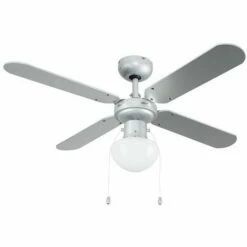 Modern MiniSun branded four blade three speed ceiling fan in a contemporary silver grey finish. Features silver blades. Includes an integrated ceiling light with on / off pull switch and opal frosted glass shade. Ideal for most rooms this ceiling fan has a directional motor so it can be used in both warm and cold conditions. Comes complete with full product guide and installation instructions. 1 x 60w ES E27 GLS Bulb Required – Not Supplied. RPM on highest setting 200 RPM on medium setting 155 RPM on lowest setting 95.