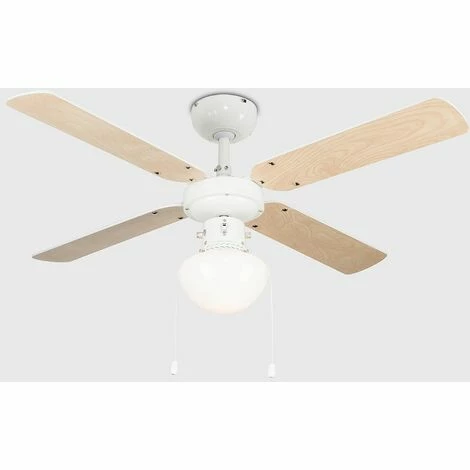 Modern MiniSun branded four blade three speed ceiling fan in a contemporary white finish. Features reversible blades in white or beech effect finish. Includes an integrated ceiling light with on / off pull switch. Ideal for most rooms this ceiling fan has a directional motor so it can be used in both warm and cold conditions. Comes complete with full product guide and installation instructions. RPM on highest setting 210 RPM on medium setting 155 RPM on lowest setting 95.