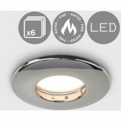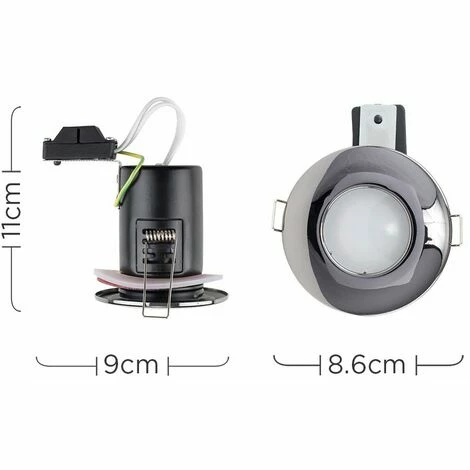 6 x Quality MiniSun fire rated GU10 Bathroom Downlights in a black chrome finish. Features 90 minute fire rating and comes complete with terminal block and pre-fitted spring clips. Supplied with product guidelines and full fitting instructions. IP65 Rated Suitable for use in bathrooms zone 1 2 and 3. Complies with BS EN60598 BS5250 BS476 parts 20 21 & 23. Cut-out hole diameter 65mm. Please Note Bulbs not supplied.