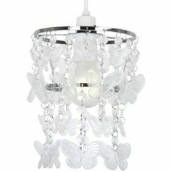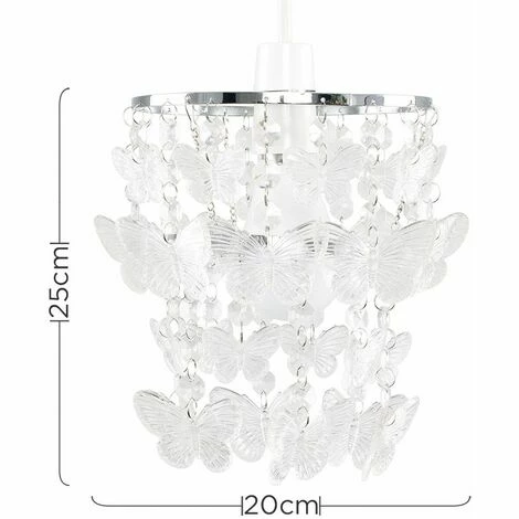 Beautiful two tiered ceiling pendant light shade chandelier. Features light-reflecting clear acrylic crystal butterflies suspended from a silver chrome metal frame which casts the light beautifully around the room. Easily fits to your standard ceiling light socket – no wiring required. A non electric ceiling pendant shade is a quick and economical way to update your room in seconds! Easy to fit to your existing lamp holder no electrician required. Suitable for use with a general domestic or energy saving bulb.