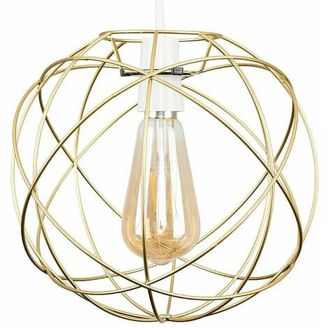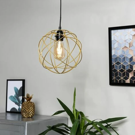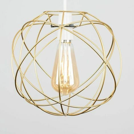 Retro style atom design ceiling pendant light shade in a gold effect metal finish. Features an open design which shades the bulb whilst allowing light to disperse effectively and evenly throughout the room.