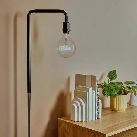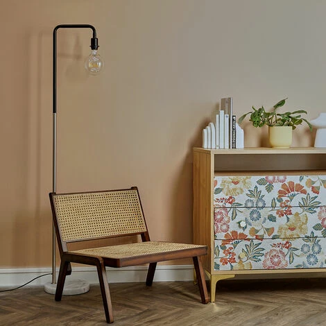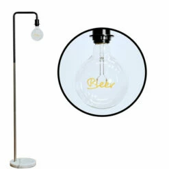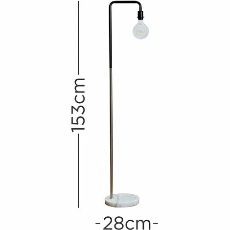 This MiniSun floor lamp comes in a black and brushed chrome finish and features an industrial style metal rod frame sat on a classic sturdy white marble base. Complete with a large worded globe bulb and in-line on /off foot switch for easy use. The decoartive filament bulb gives off a warm ambient glow great for complementing any decor.