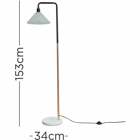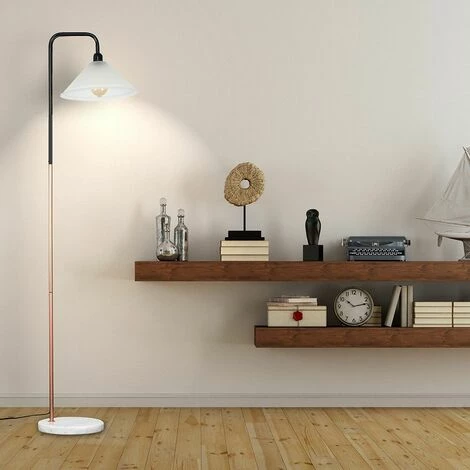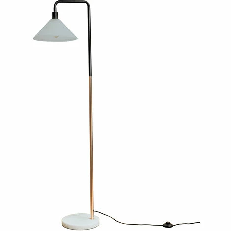 Retro style metal rod frame floor lamp in a matt black and copper finish with a white solid marble base. This lamp is constructed from high quality materials and the marble base makes this lamp extremely sturdy. This contemporary floor lamp is guaranteed to make a statement in any home. Complete with a white frosted glass tapered light shade.