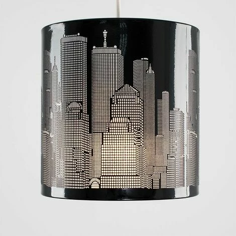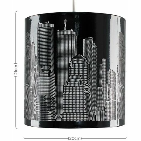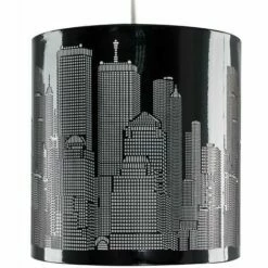 The beautiful New York skyline cut-out design shade in a gloss black finish lights up beautifully when the light is switched on. This shade easily fits to your existing light fitting in matter of seconds – no electrical installation required. The ideal bulb to use with this item is a 60w BC (bayonet cap) GLS bulb – not supplied. Please Note This lamp requires dimmable bulbs. Not suitable for standard LED or energy saving bulbs.