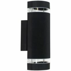 Modern curved ribbed effect aluminium wall light fitting in a matt black finish. The fixture has a stylish contrasting clear glass light shade allowing the light to disperse evenly from the top and bottom. It also offers an IP54 rating making it a weatherproof light – fully certified for outdoor installation. It is an ideal product to help create a warm and inviting glow to doorways porches and external walls and an elegant way to add security to your home as well as outdoor decorative lighting.