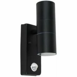 This stylish wall mounted up / down outdoor light has a stunning modern jet black flush cylinder design and is ideal for lighting gardens paths garages patios courtyards decorative porches and driveways. As well as being IP44 outdoor weatherproof rated this external light also features a practical integrated PIR motion detector – providing extra security for the home and giving peace of mind. The wall-mounted outdoor flush light comes in a sturdy and weatherproof durable black design and emits bright light from both the top and bottom. This robust illuminating external light is IP44 Rated and is fully certified for outdoor installation.