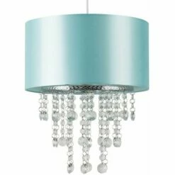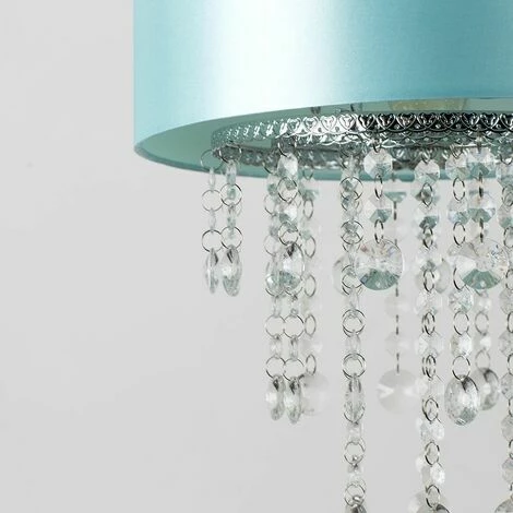Modern cylinder ceiling pendant light shade in a duck egg blue fabric finish. Features cascading light-reflecting clear acrylic jewel effect droplets which cast the light beautifully around the room. Easily fits to your standard ceiling light socket – no wiring required. With a variety of colours available this elegant lampshade goes perfectly with almost any style of interior design.