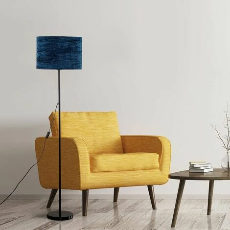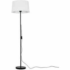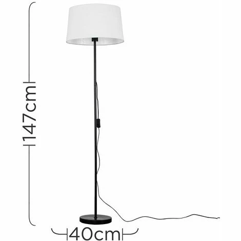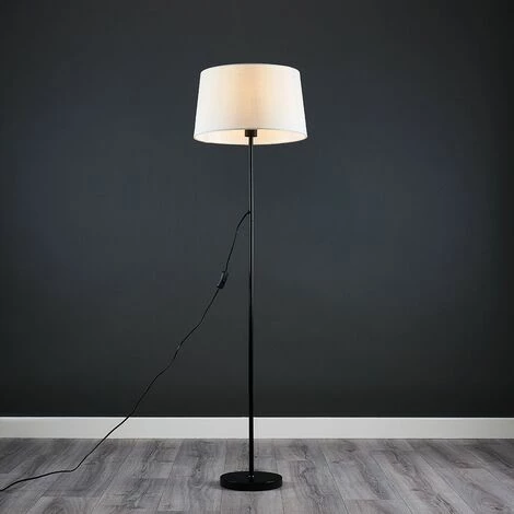 Modern standard tall stem floor lamp in a black metal finish a tapered shade in a white faux linen fabric finish.