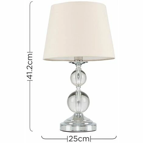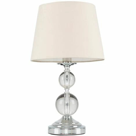 Modern touch table lamp in a polished chrome finish featuring clear acrylic balls on the stem. Complete with a beige tapered light shade. Simply touch the metal base to turn the lamp on – no more trying to find the switch at night. The light can be set to 4 stages off a low level light for mood lighting a medium level light for general lighting and a high level light which is the brightest setting to create an intense pool of light. Table lamps are a great way to bring additional lighting to a room or you can use them reduce your main light output and create a more relaxing mood/atmosphere. Please Note These lamps require dimmable bulbs. Not suitable for standard LED or energy saving bulbs.