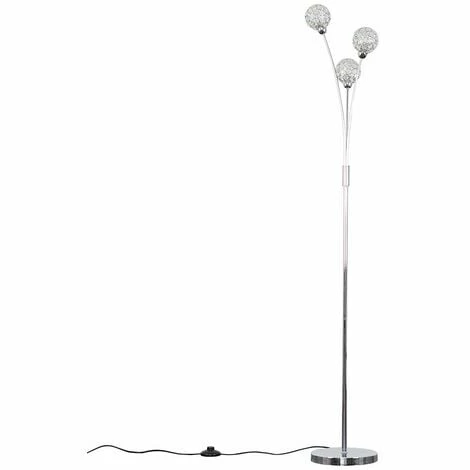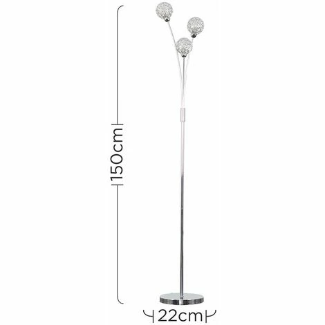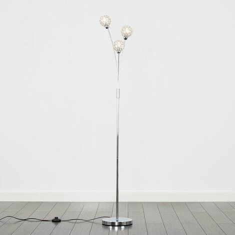 Modern 3 way floor lamp in a polished chrome metal finish. Complete with clear acrylic jewel detail globe shades and features an in-line on/off switch for easy use. Ideal for lounges hallways bedrooms and other areas around the home. When switched on the shades cast a subtle pattern creating a warm and relaxing atmosphere. Floor lamps are brilliant as complementary lighting and are perfect to light up dull corners.